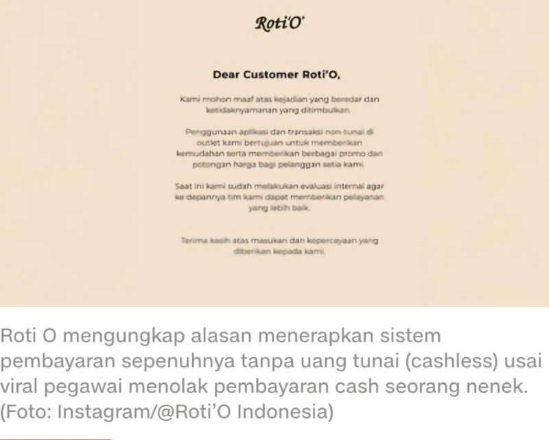 Jakarta, BeritaRuang- Manajemen Roti O menyampaikan penjelasan resmi terkait kebijakan pembayaran nontunai yang diterapkan di sejumlah gerainya, menyusul beredarnya video di media sosial yang memperlihatkan adanya pelanggan yang tidak dapat melakukan transaksi menggunakan uang tunai.