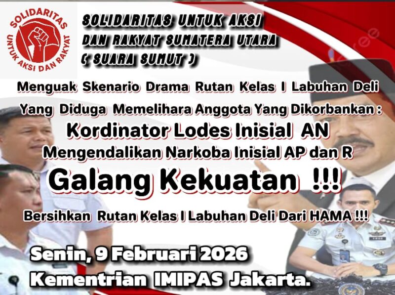 Medan – Solidaritas Untuk Aksi dan Rakyat Sumatera Utara (SUARA SUMUT) mendesak Menteri Imigrasi dan Pemasyarakatan (Imipas) untuk mencopot Kepala Rumah Tahanan (Karutan) Kelas I Labuhan Deli serta Kepala Pengamanan Rutan (KPR). Keduanya dinilai bertanggung jawab atas dugaan pembiaran narapidana menggunakan handphone dan mengendalikan peredaran narkoba dari dalam rutan.